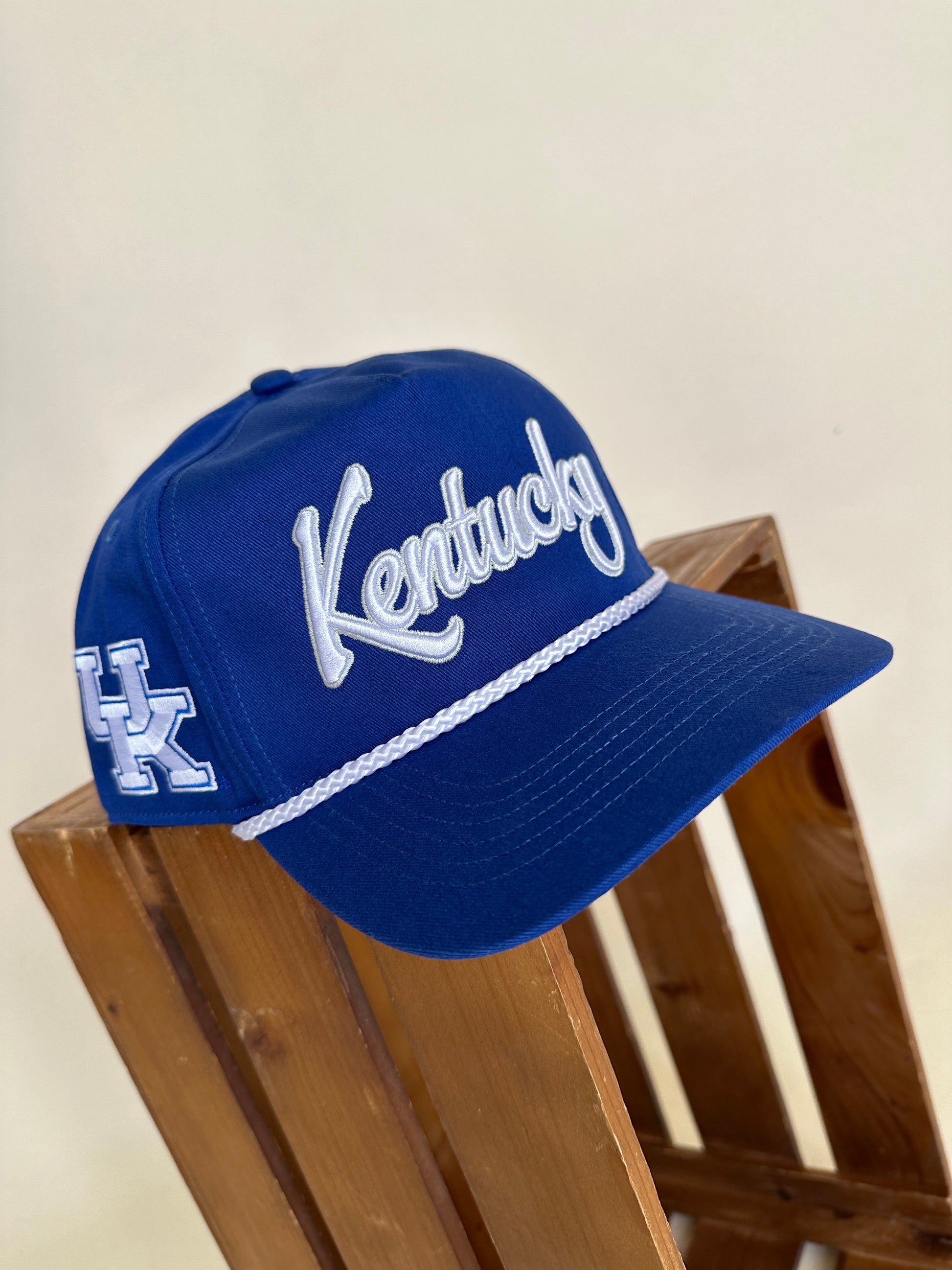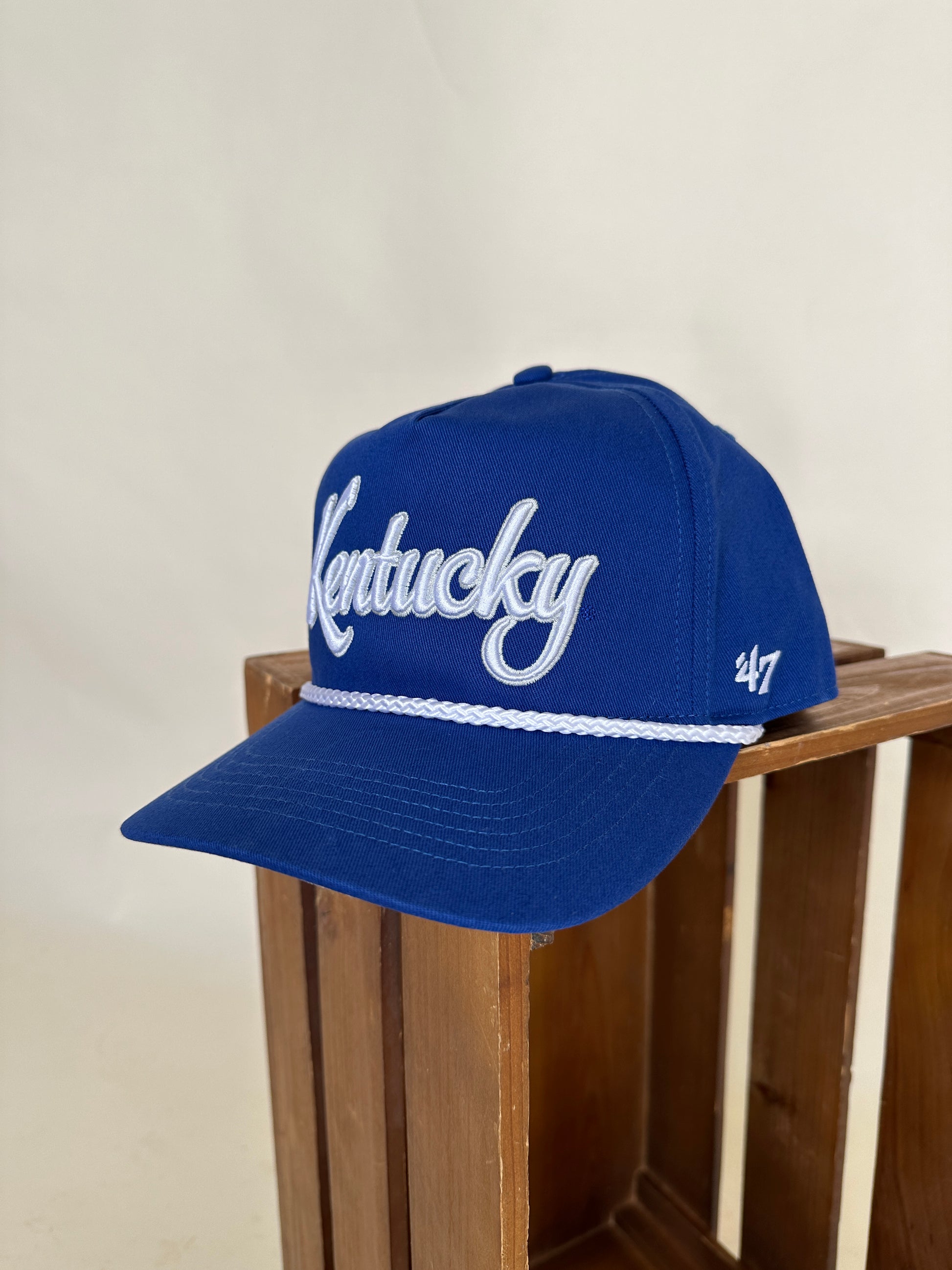 The Overhand Script '47 MVP DV is a structured and curved adjustable with raised embroidery on the front, flat embroidery on the side, a plastic snap closure, and a braided nylon rope along the visor. Made from garment washed cotton twill. Vintage navy.