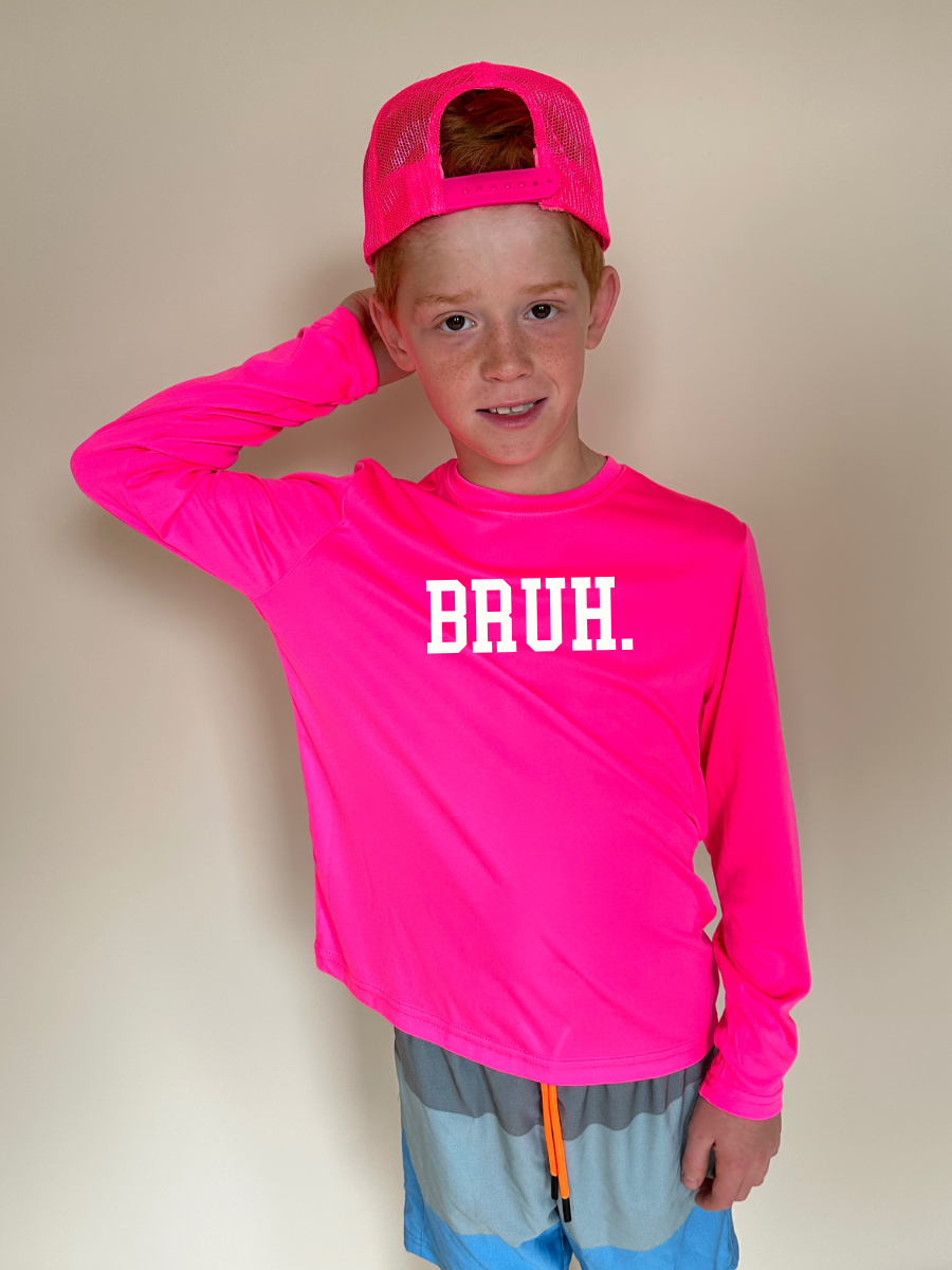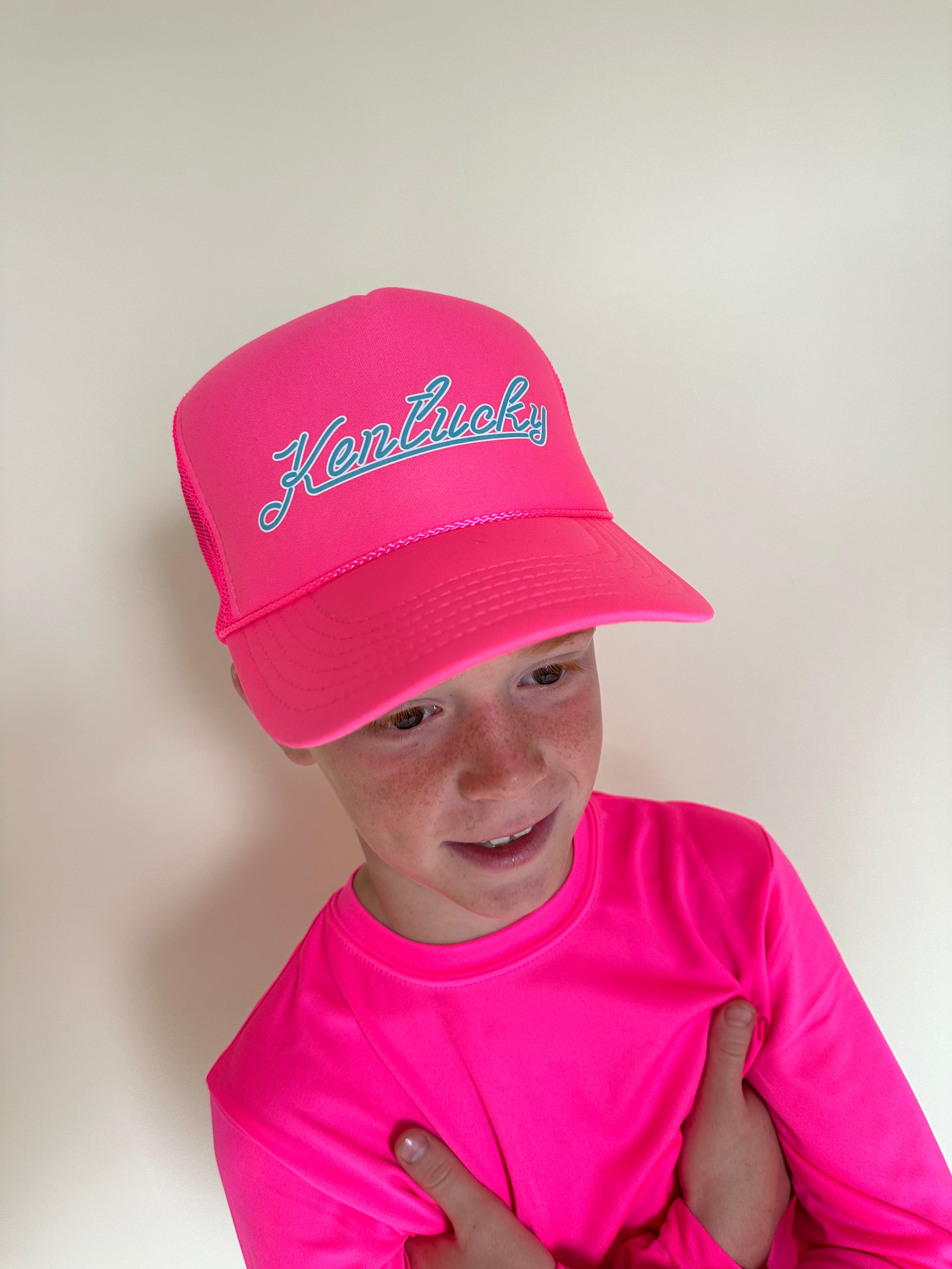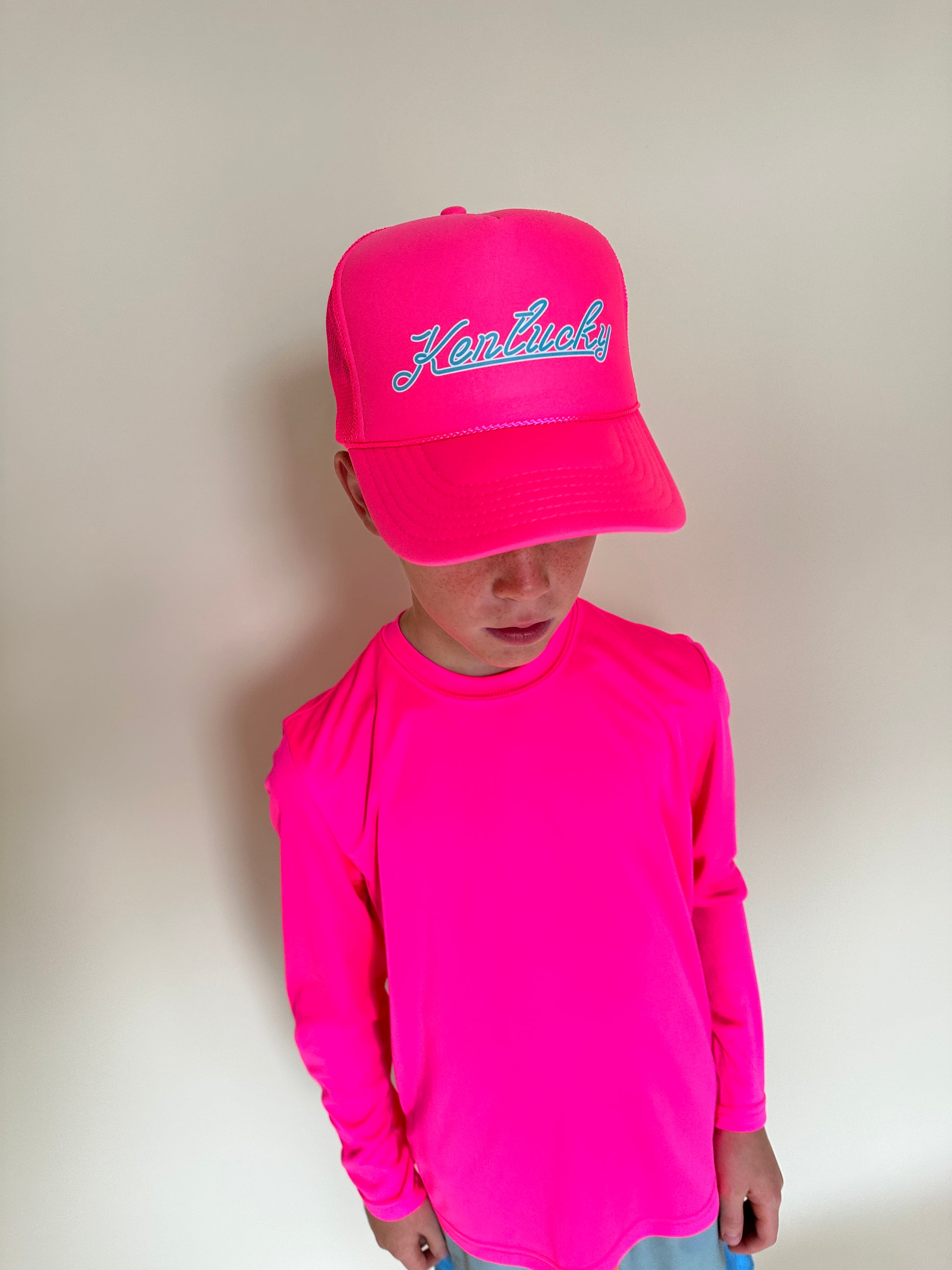 Adult hot pink foam snapback trucker hat with printed neon sign style turquoise logo.