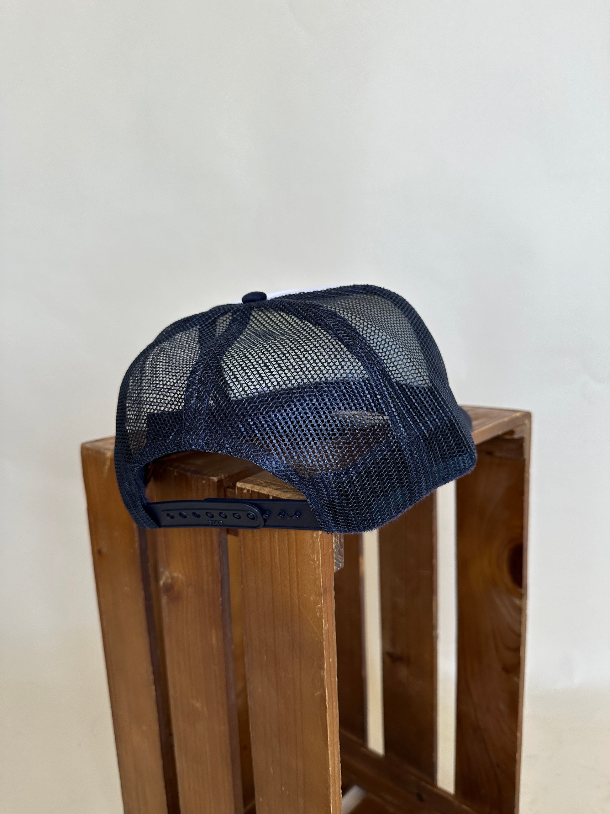 Two tone navy/white snapback trucker hat with printed logo.