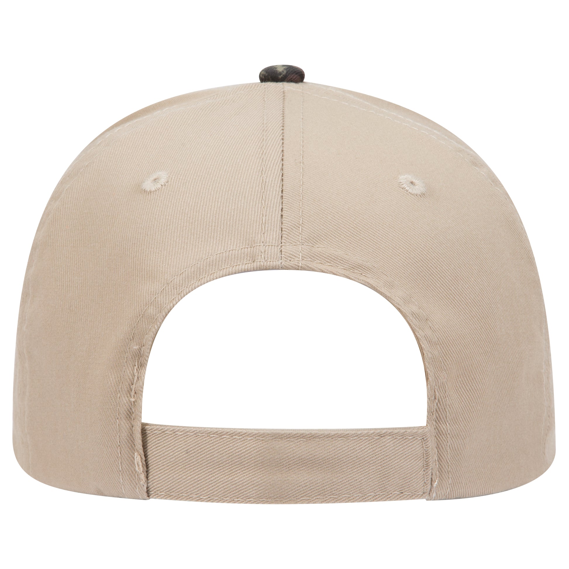 - Camo bill and top button, khaki body and eyelets, adjustable hook and loop closure