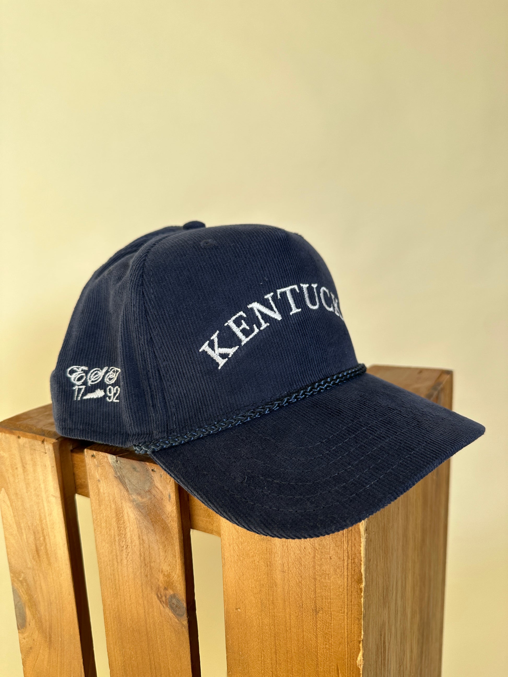 A favorite snapback with our favorite state embroidered in arch lettering front. EST 1792 embroidered right side logo. Navy/white