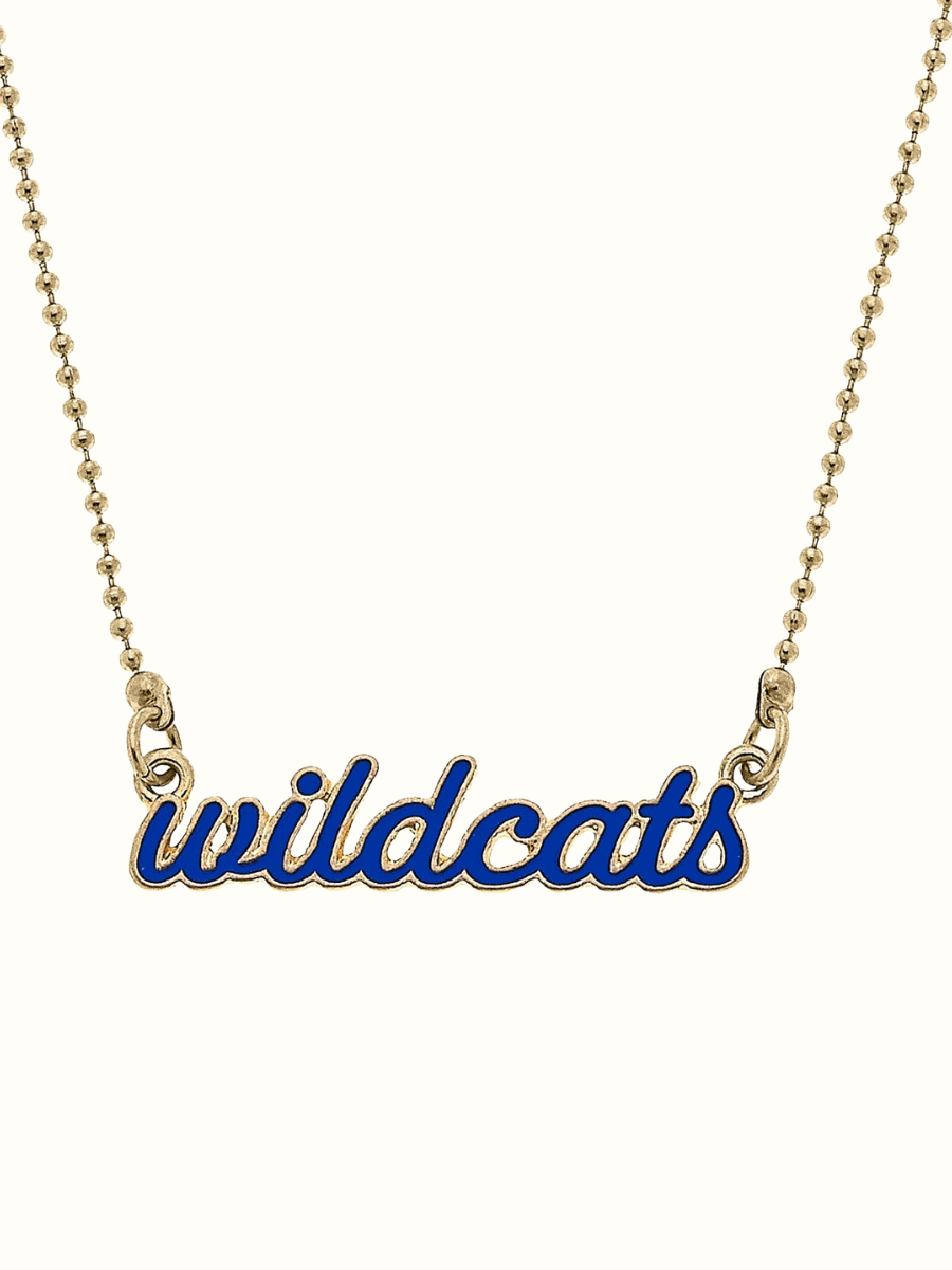 Represent your team in style with this Kentucky Wildcats Enamel Script Necklace in Blue! Perfect for game day (or any day), this necklace features the iconic "wildcats" script. Show off your spirit with this dainty accessory.