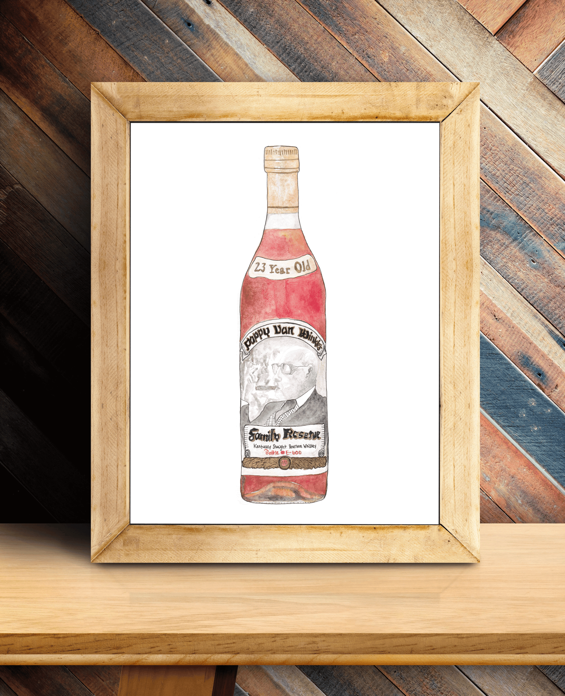 From the artist: I'm surrounded by bourbon fanatics because I live in the heart of Bourbon Country, Kentucky. My husband being one of those fanatics, stayed on my case about doing a pappy painting. I'm so glad he did, because I love how it turned out. If you love bourbon then you have heard of Pappy Van Winkle. I decided to paint the 23 year old because it's so hard to get your hands on the actual thing! This print will be the best gift for all the bourbon loving fanatics in your life. It would make such a great addition to your bar nook too. This print would make a unique groomsman gift or housewarming gift for a stock the bar theme. **Frame is not included** Cheers!!