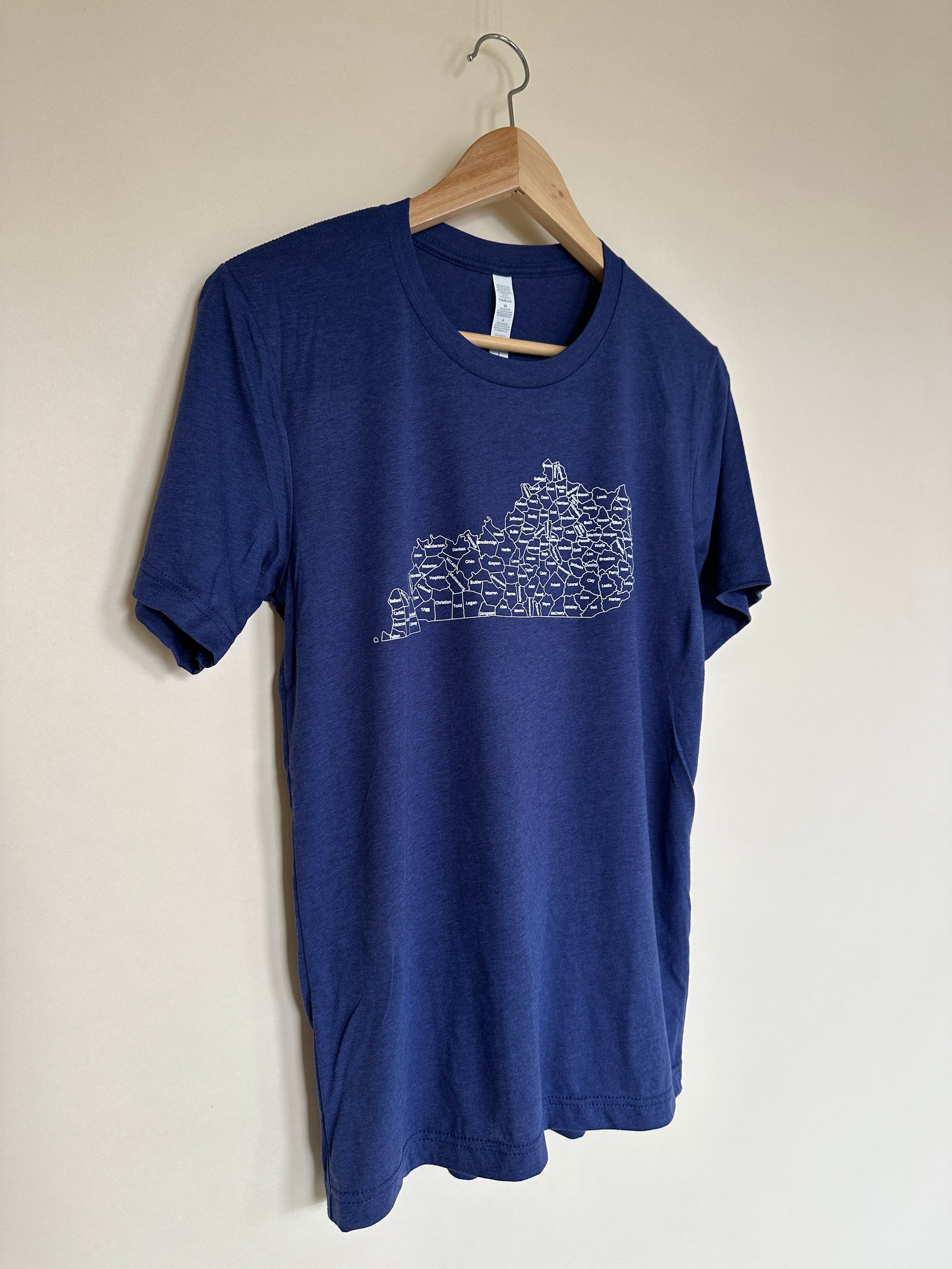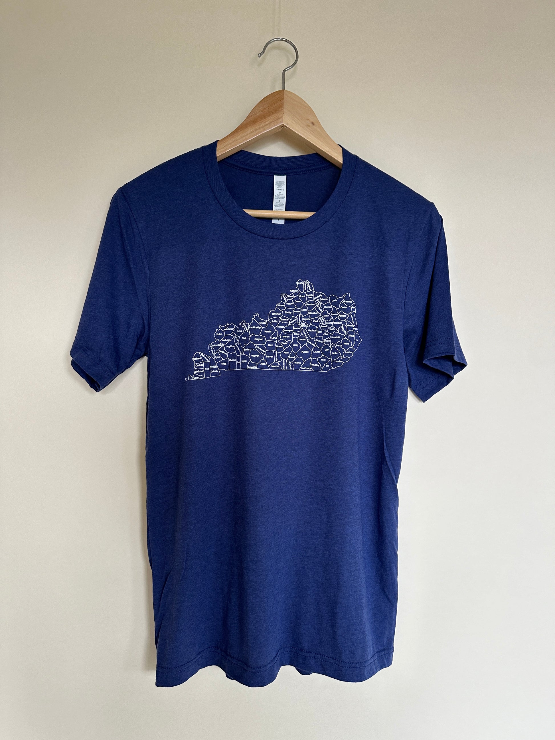 Adult unisex triblend navy tees with white screenprint logo of Kentucky’s many counties