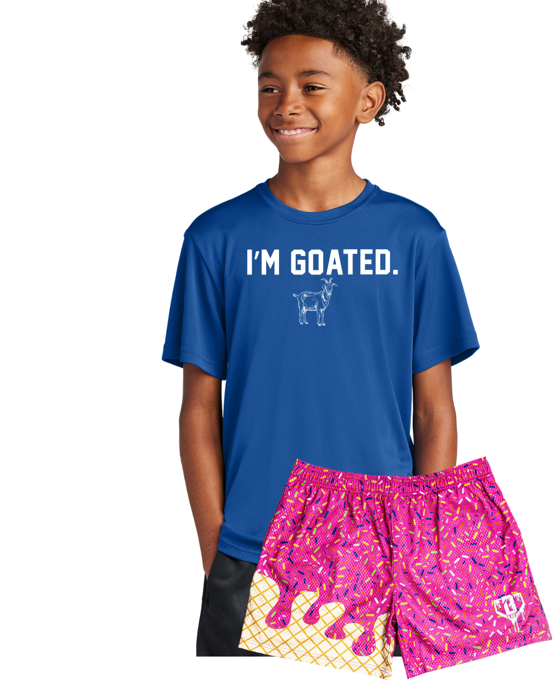 Youth unisex dry fit SHORT SLEEVE with navy screenprint logo.