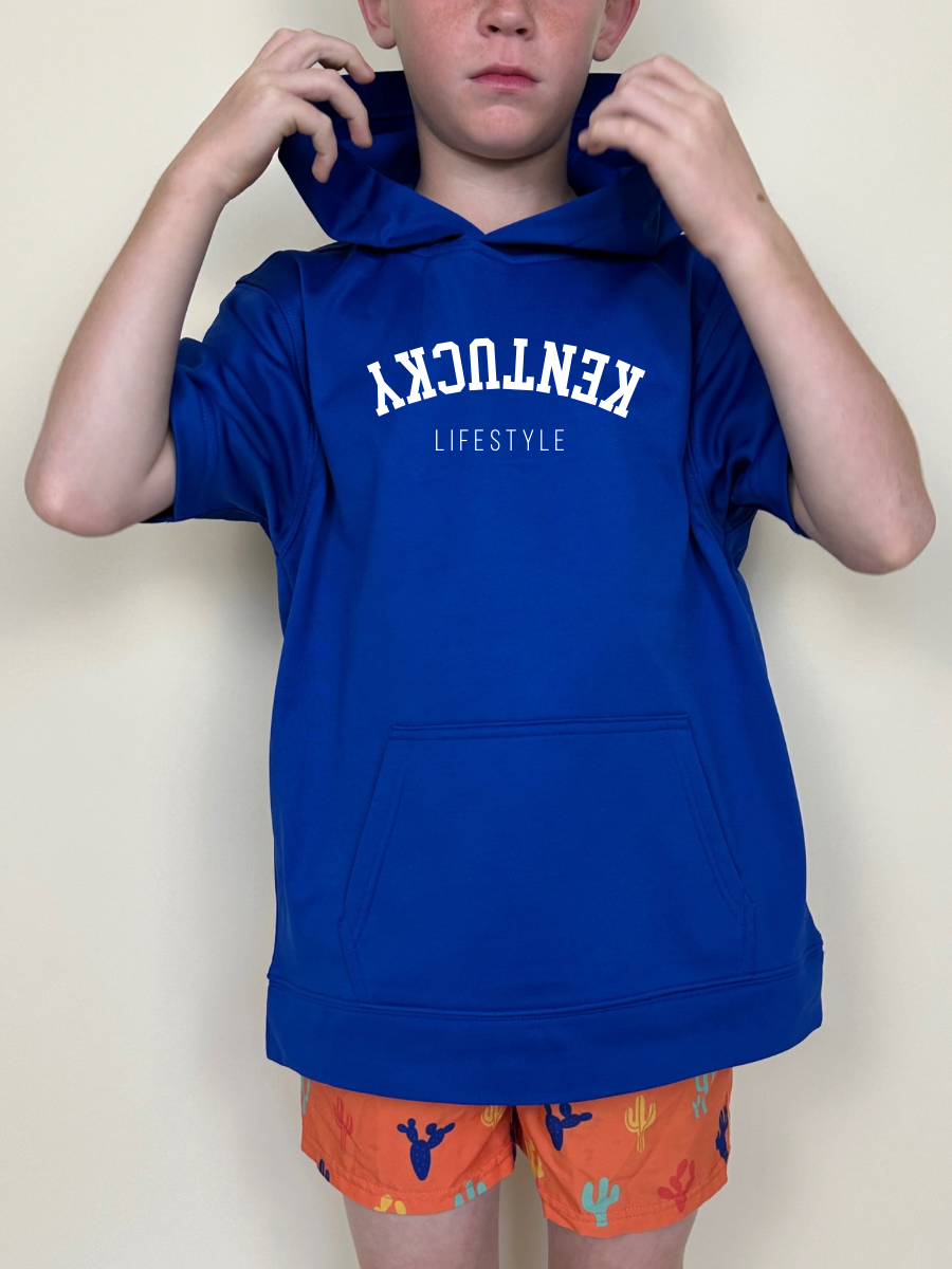 Youth size sport wick pullover short sleeve hoodie with upside down KY Lifestyle logo in white screenprint.