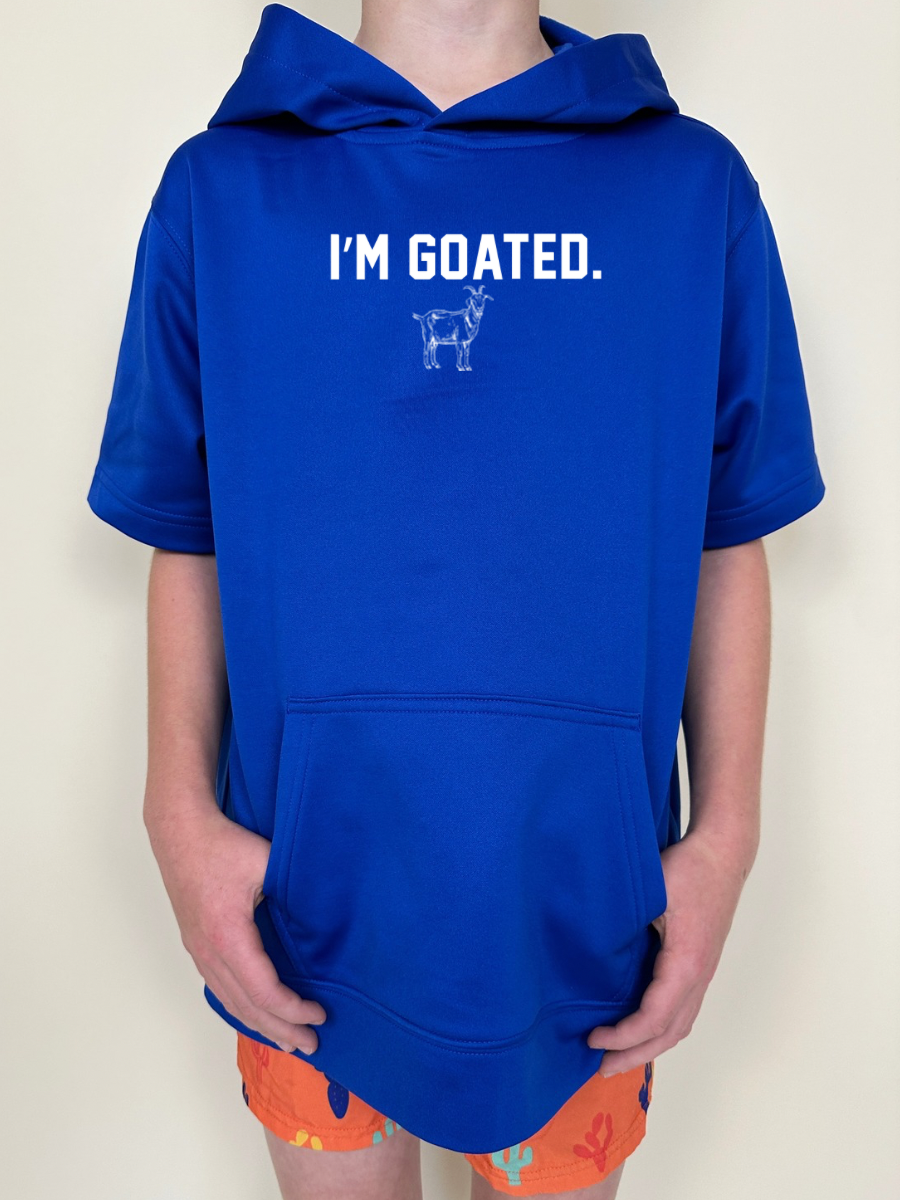 Youth size sport wick pullover short sleeve hoodie with Goated logo in white screenprint.